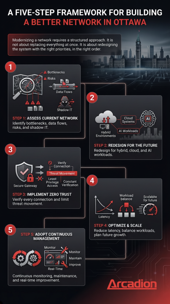 Through a continuously managed model, organizations move from reactive environments where problems are discovered after they cause damage, to proactive infrastructure that is maintained and optimized in real time. Arcadion’s infrastructure modernization services are built around this approach, helping Ottawa businesses redesign and manage networks that can support real operational demands.
